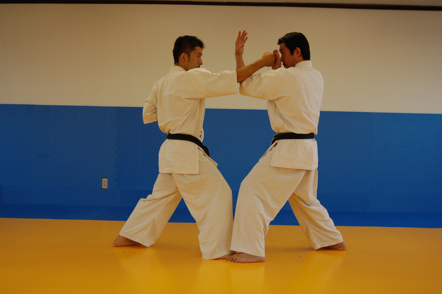 受け手が一歩踏み込み、上段追い突きで攻撃を仕掛ける。同時に仕手(応じ手)は左足を一歩踏み込み、上段挙げ受けで、受け手の上段突きの軌道をずらす。