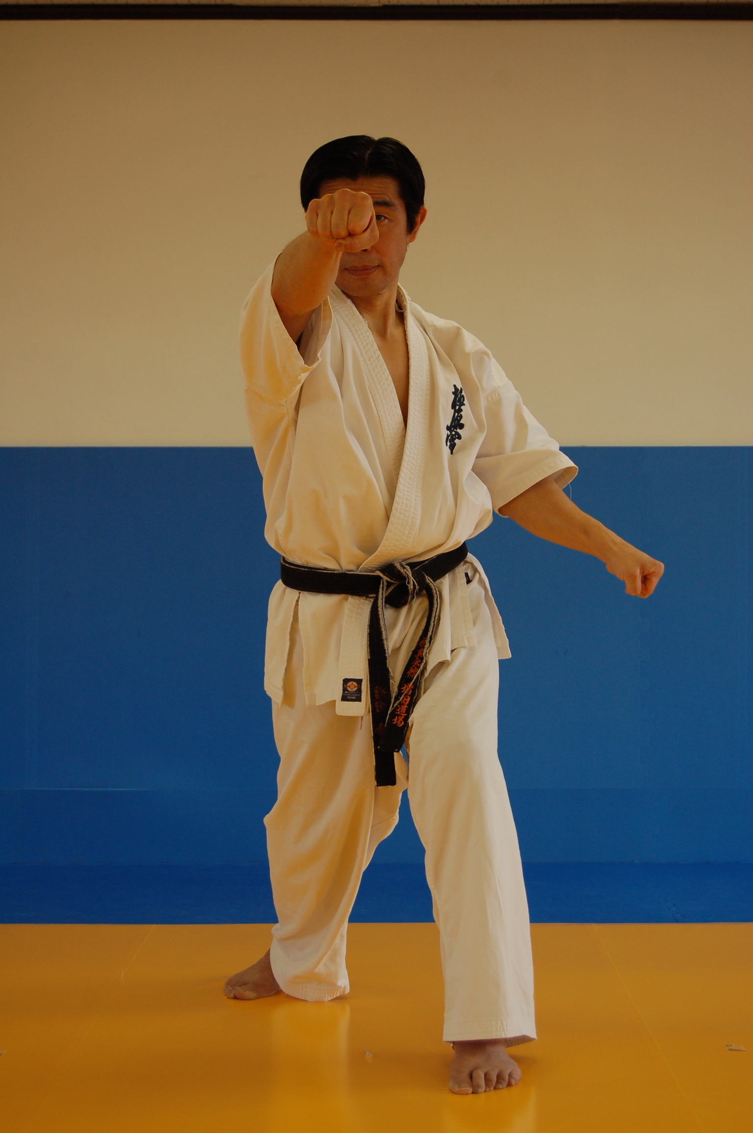手刀を相手の腕を滑らすように下に持っていきながら、最後に手首を掴み、逆突きを上段に決める。