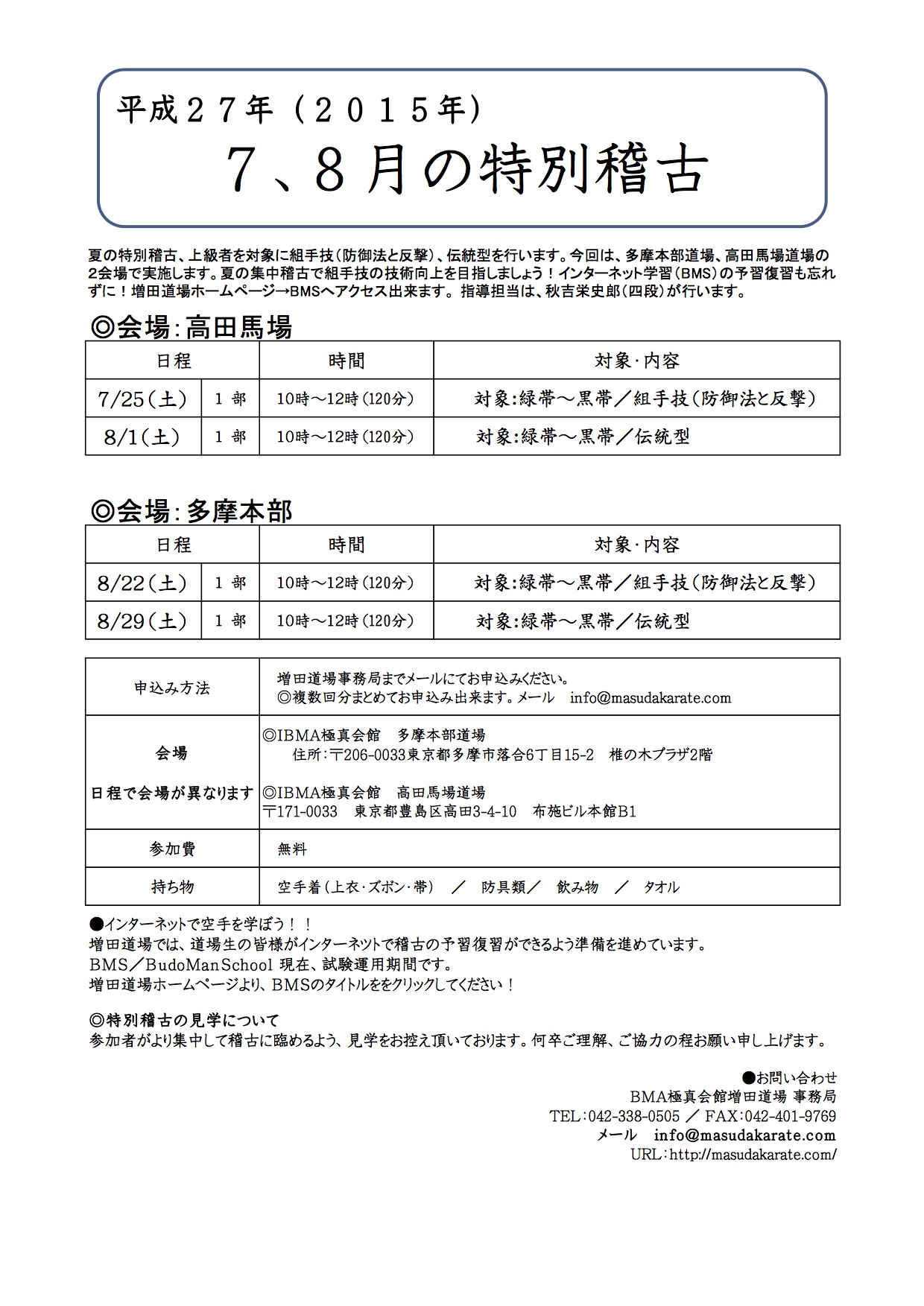 2015年 7月8月 特別稽古 告知