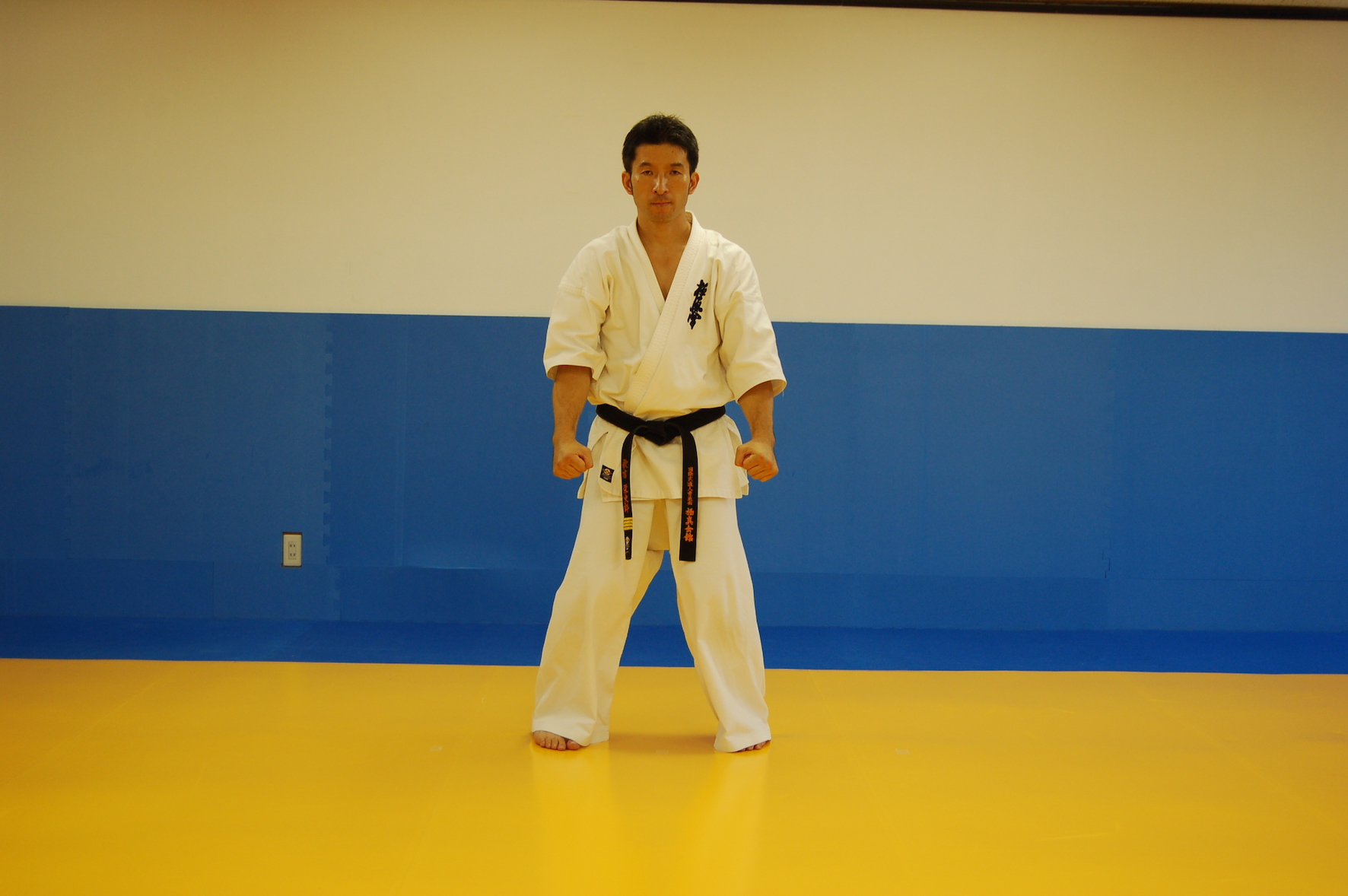7)三戦立ちから不動たちに直る時は、両腕を肘を中心に回し、下に下ろしながら、前に出した右脚を、内八時立ちから前に出すときの逆に戻しつつ、内八字立ちになる。内八字立ちになったところで、踵を内側に入れて外八字立ちとなる。
