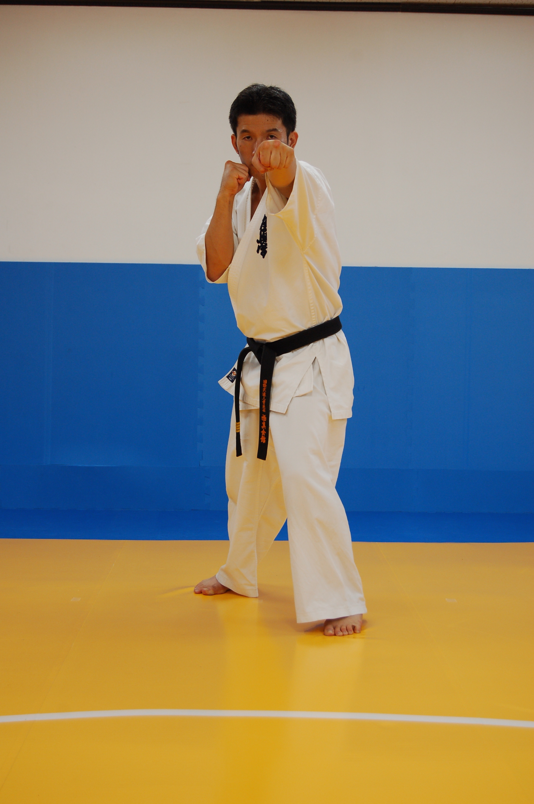 3)左の腰を少しいれながら、前拳を伸ばして目標に正拳を当てる。腕は肩を少し入れるようにして伸ばしきる。