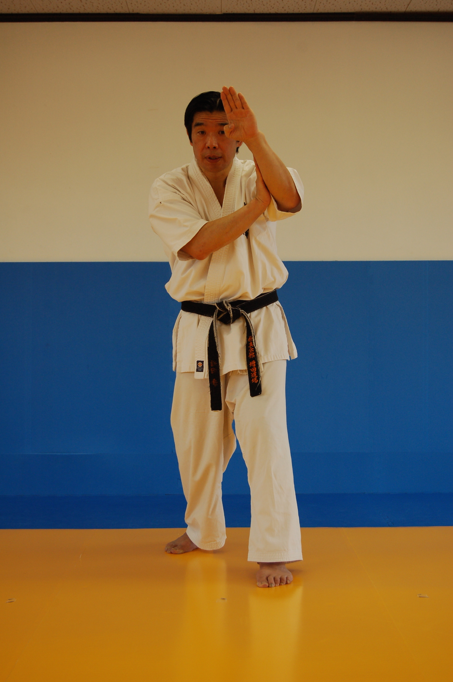 1)左腕の上げが不十分。この形だと、左斜め上部(約45度以上)からの攻撃を防御することができない。