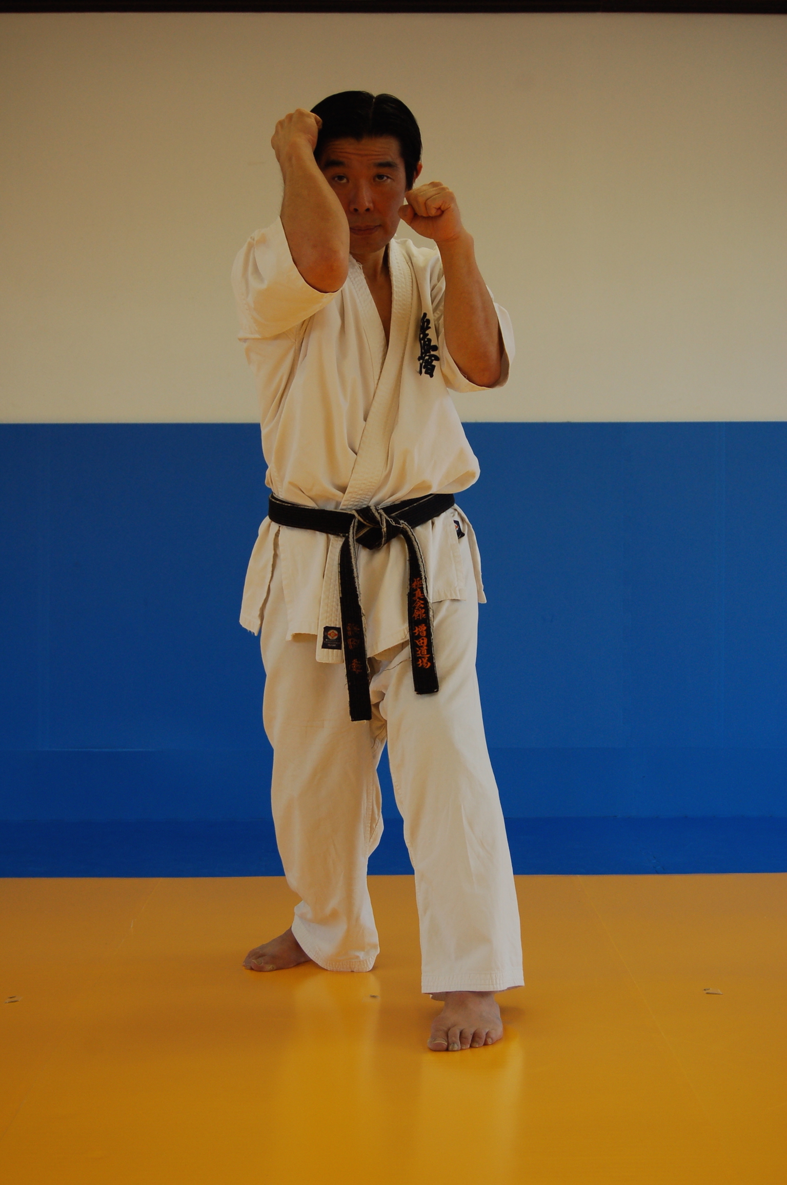 2)右の肘・内受け。右肘を下から打ち込むようにして上中段の直突きなどの攻撃を防御する。