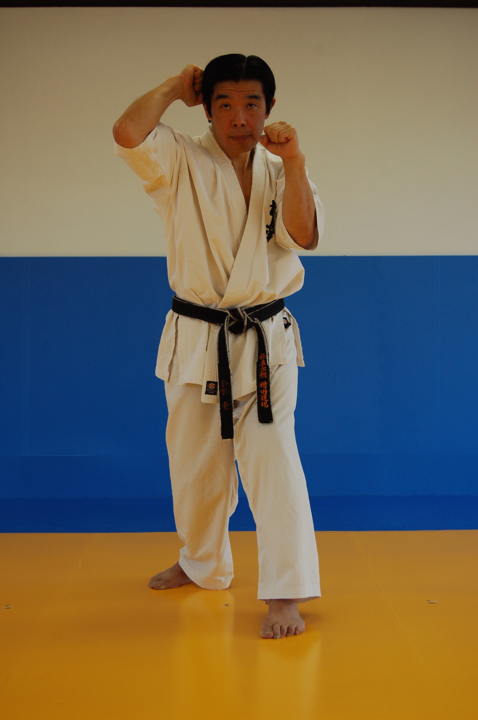 4)右の肘・外受け。右肘を外側に向け、下から打ち込むようにして上中段の鍵突きなどの攻撃を防御する。