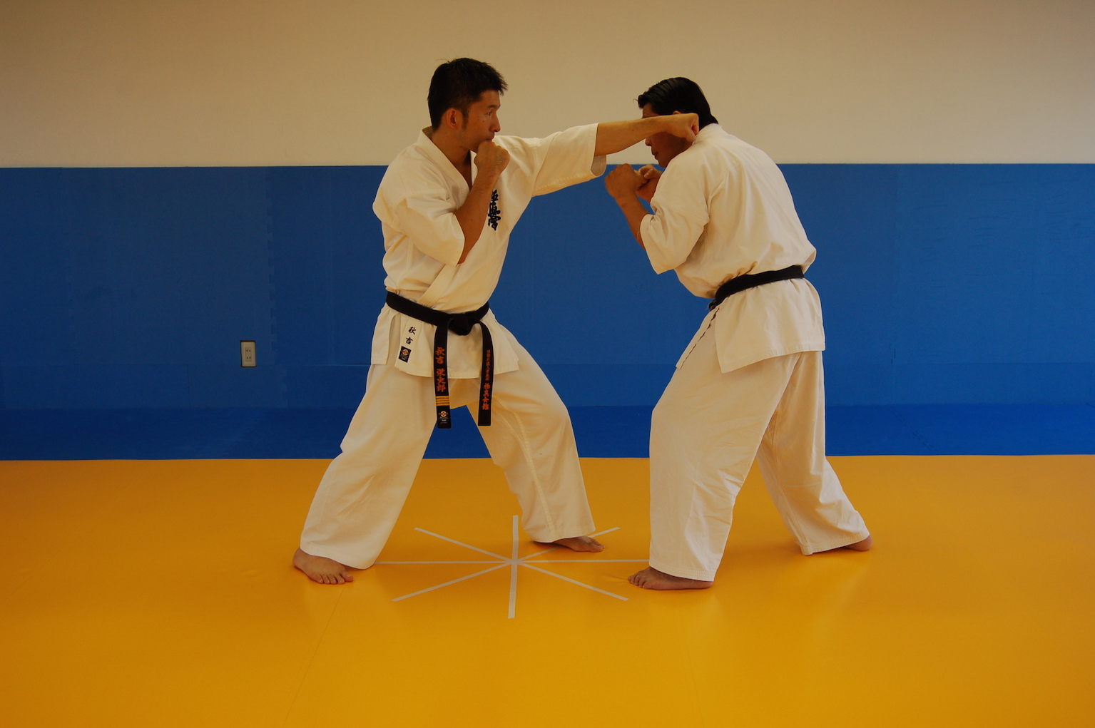 4)仕掛手の順上段直突きを上体を右に捻ってかわす。(相手の外側へ)