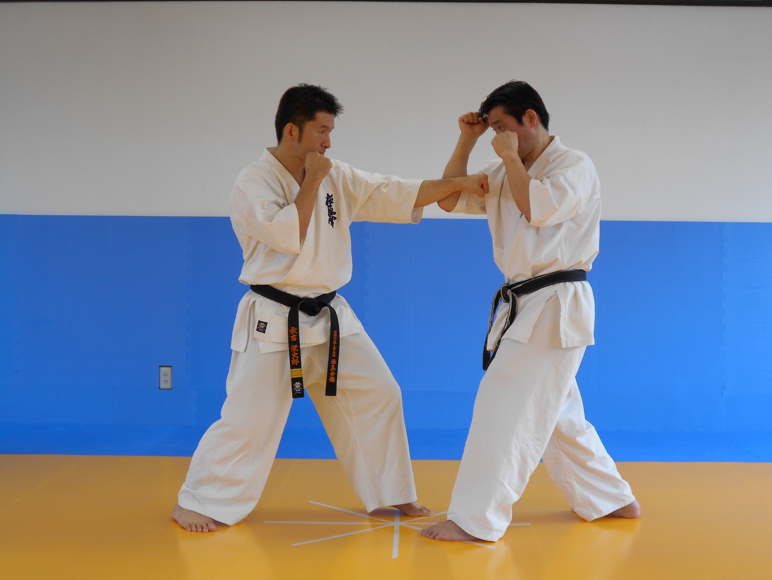 5)「仕掛け手」の順上中段直突き対し「右肘内受け」で受ける(応じる)。
