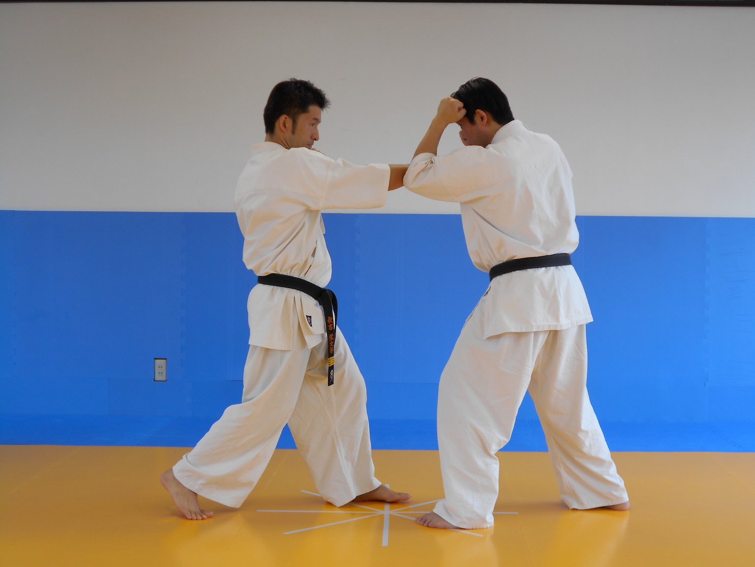 6)仕掛け手の逆上中段直突きに対し「左肘内受け」で受ける(応じる)。